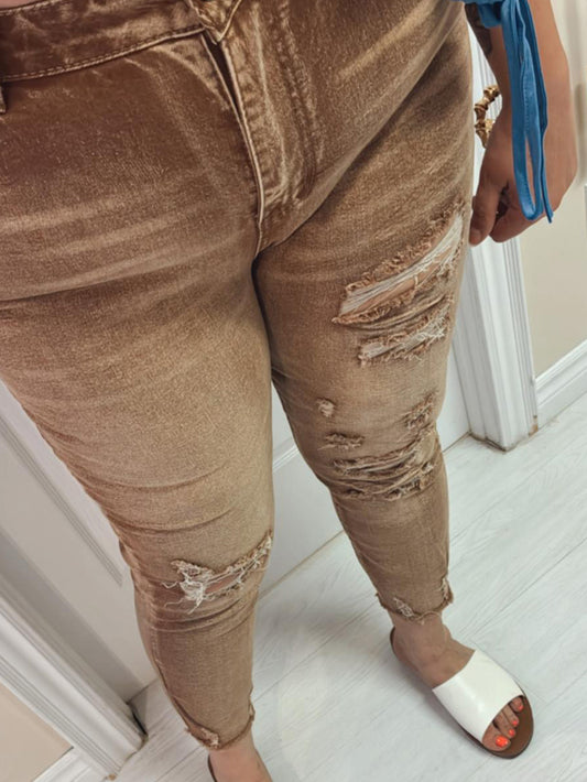 Yvette Plus Size Distressed Girlfriend Jeans in Tan
