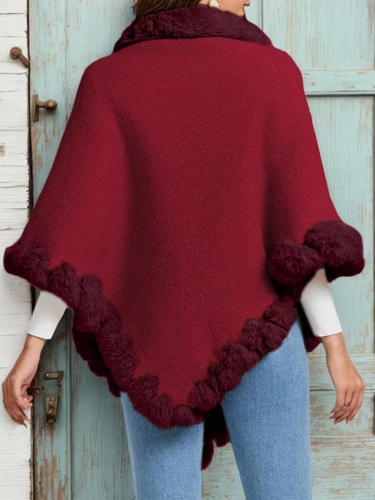 Cozy Knitted Poncho With Faux Fur Trim Burgundy