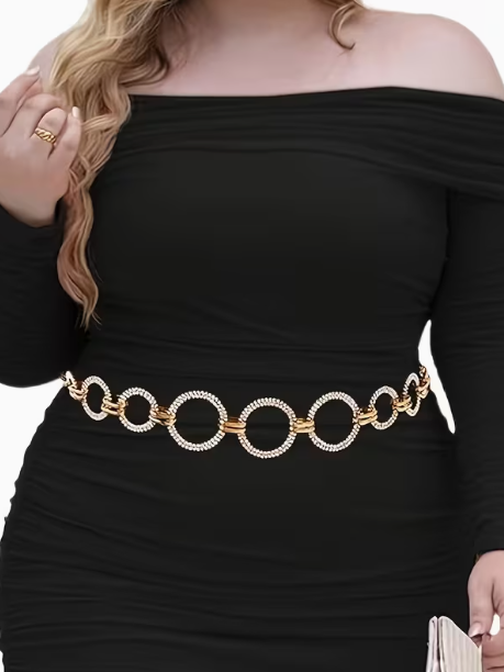 This statement gold chain belt features a bold circular link design accented with subtle sparkle for a polished, eye-catching finish. Designed to sit comfortably at the waist or hips, it adds instant definition and shine without feeling heavy or overdone. The adjustable clasp allows for flexible styling across a range of silhouettes, making it an easy add-on to elevate your look.