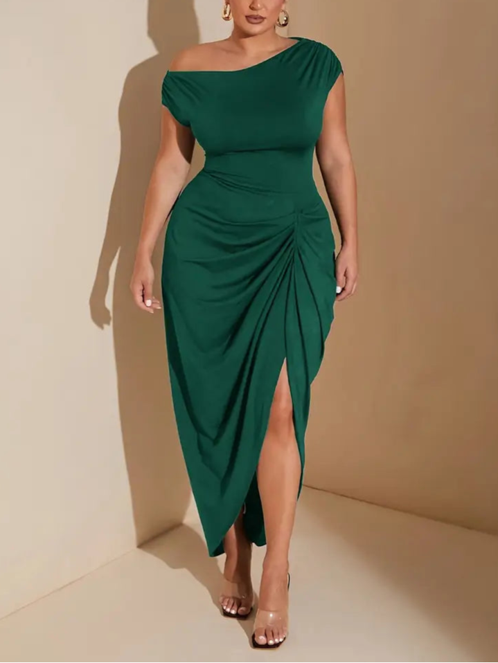 This plus size cocktail dress is designed to turn heads with its elegant, asymmetrical neckline and figure-enhancing drape. One shoulder sits off the shoulder for a sultry effect, while gentle pin tuck detailing at the front and back shapes the dress into a beautiful tulip silhouette with a side slit that adds subtle drama. The true-to-size fit hugs your curves in all the right places without feeling restrictive.