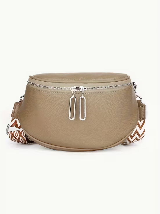 Crafted from genuine leather, this versatile crossbody bag is designed in a sleek tan shade with a modern rounded silhouette. Featuring a secure double zipper closure and an adjustable patterned strap with geometric detail, this bag combines durability with everyday style. Measuring 21 cm (8.27") in width, 13 cm (5.12") in height, and 7 cm (2.76") in depth, it’s compact yet roomy enough for your daily essentials.