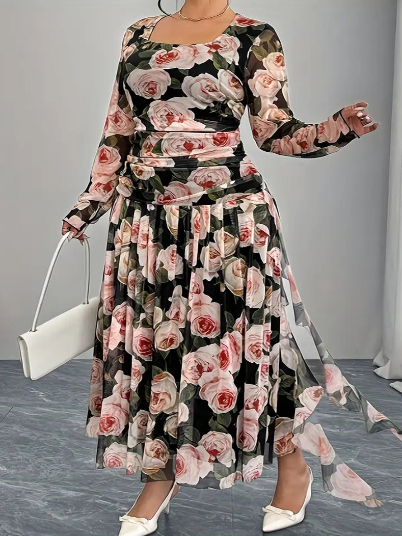The Rose Floral Print Plus Size Cocktail Dress is designed to flatter with its square neckline, sheer long sleeves, and ruched waist that defines your curves. The flowing pleated skirt moves gracefully with every step, while the bold rose print adds romance and elegance to your look.