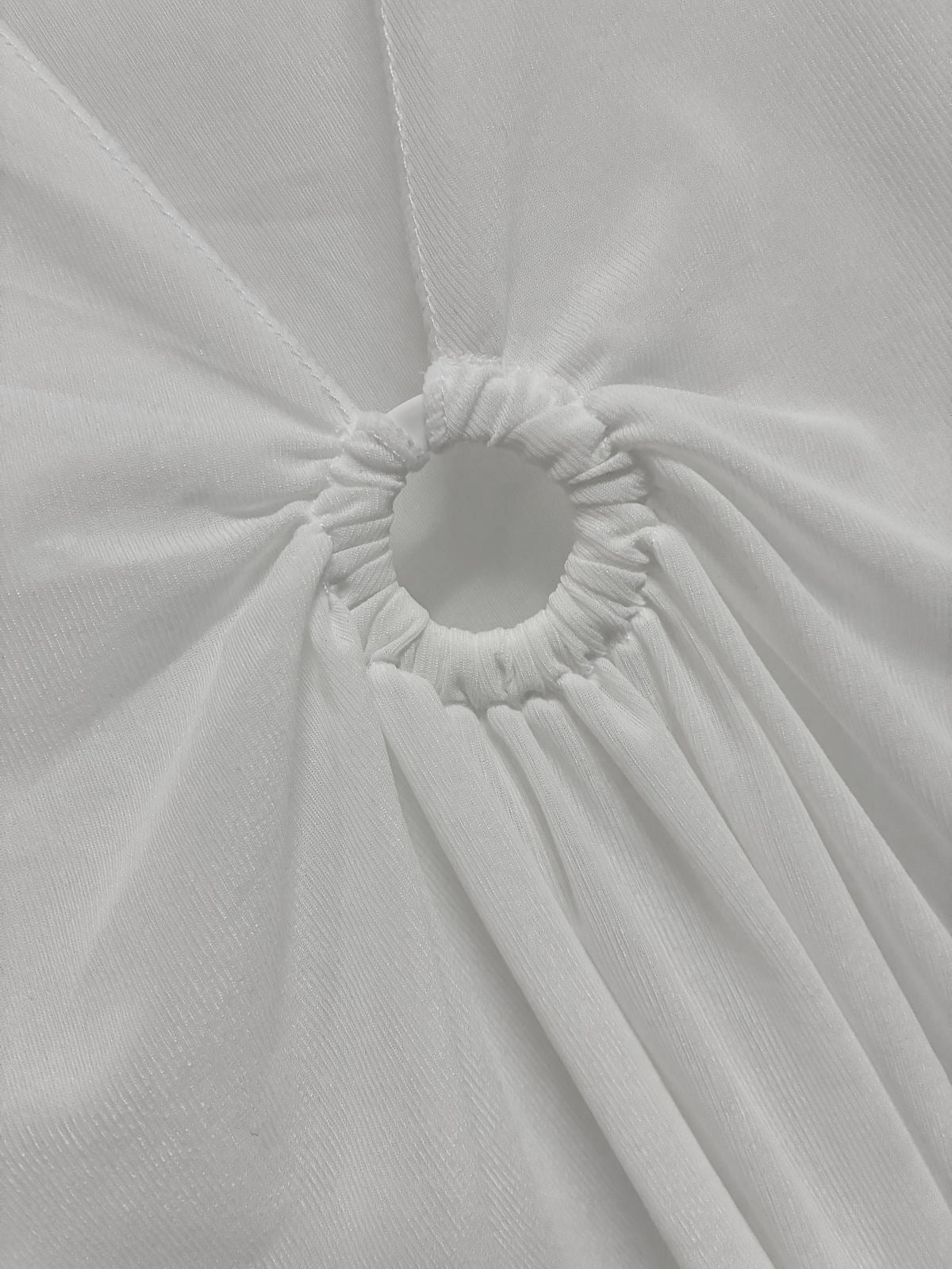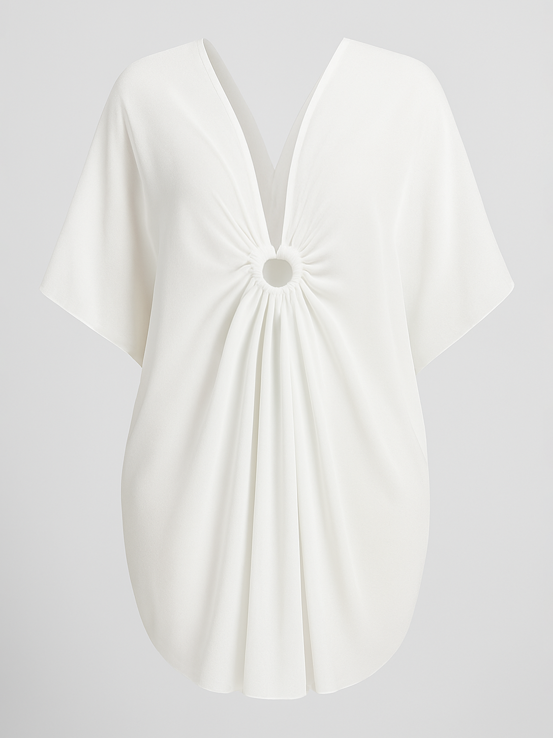 A breezy white beach cover-up with a plunging neckline and ring detail at the center front. The flowy, relaxed silhouette drapes beautifully over swimwear, making it a versatile piece for beach days or poolside lounging.