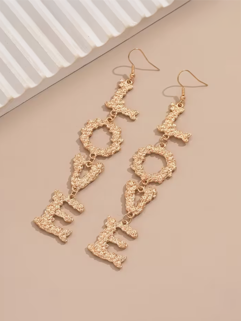 These gold-tone drop earrings feature textured lettering that spells LOVE, designed to catch the light with every movement. Lightweight with a comfortable hook backing, they bring just the right mix of statement and wearability. The dimensional finish adds sparkle without feeling heavy or overdone.