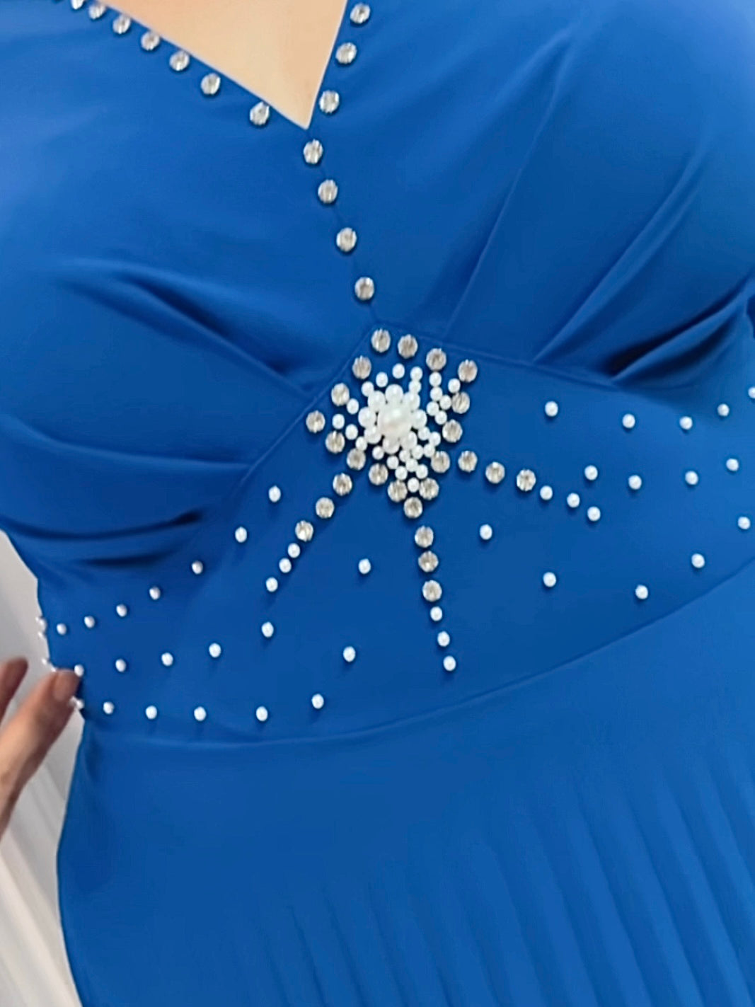 The Ophelia V-Neck Pleated Plus Size Dress is a show-stopping gown designed to make an elegant statement. Featuring a deep V-neckline, long sleeves, and a flowing pleated skirt, it flatters your curves while offering graceful movement. Rhinestone detailing at the waist creates a starburst effect that draws the eye and adds a touch of sparkle, perfect for formal occasions and special evenings.