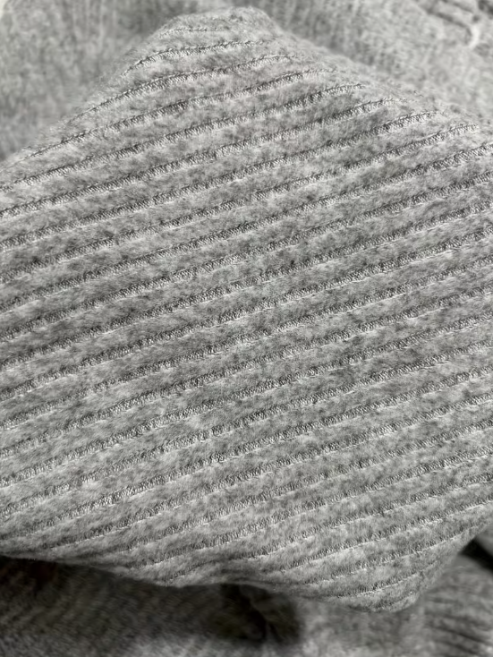 Soft ribbed knit with comfortable stretch and a cozy, lightweight feel. The fabric is breathable yet substantial enough to hold its shape throughout the day.