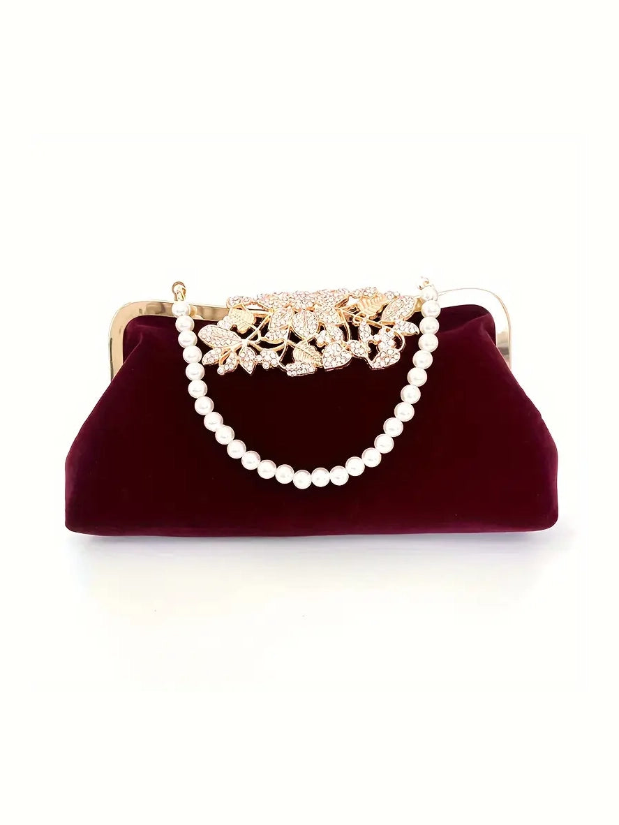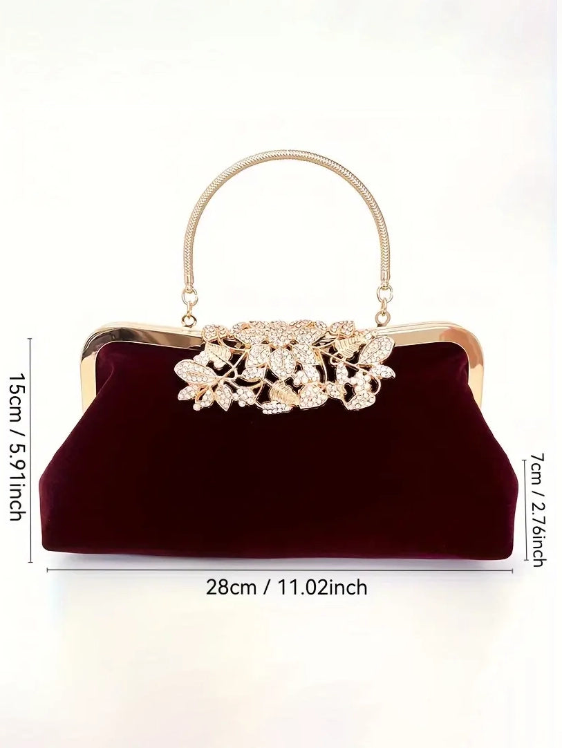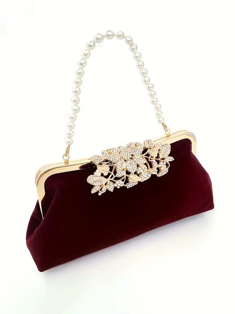 This elegant burgundy velvet evening bag is finished with a sparkling floral rhinestone clasp and gold-tone frame. Designed with versatility in mind, it features an interchangeable handle so you can choose between the pearl-beaded strap or the sleek round metal handle. The bag measures 28 cm (11.02") in length, 15 cm (5.9") in height, and 7 cm (2.76") in width, making it the perfect size for carrying your essentials.