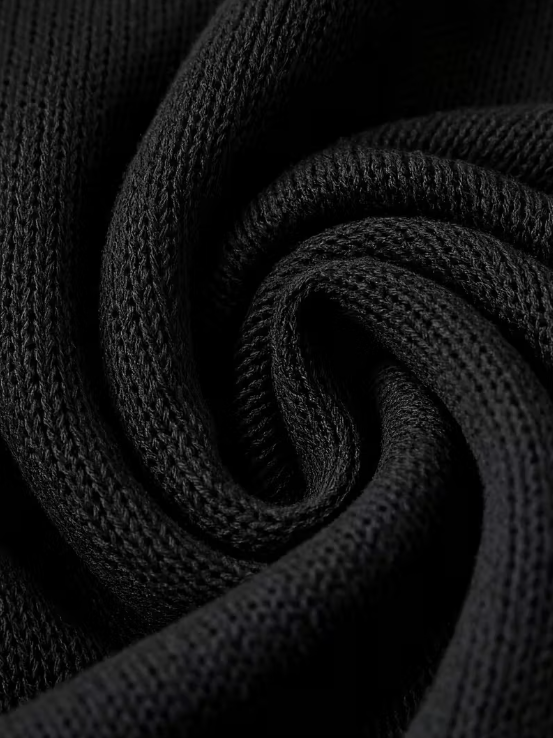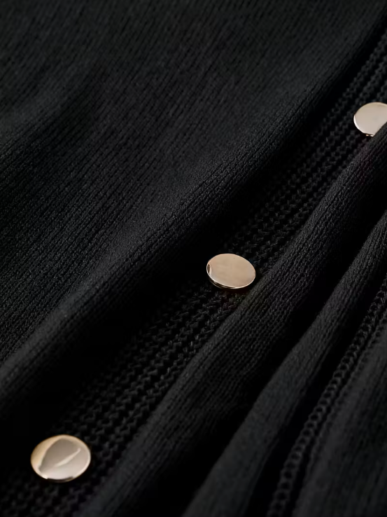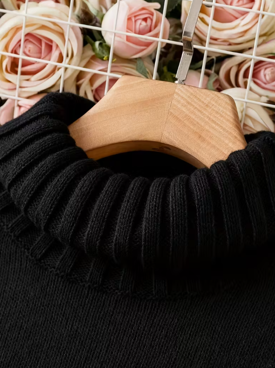 Elevated and effortlessly chic, this black knit dress blends simplicity with statement detail. The mock turtleneck and soft A-line silhouette flatter every curve, while the textured cable knit trim and gold-tone button accents along one side add a modern touch. Long ribbed cuffs complete the look, giving it a cozy yet polished vibe perfect for cooler days.