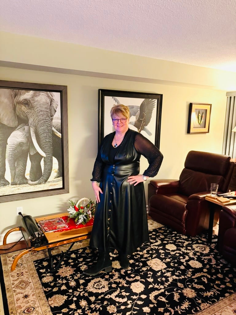 A sleek black faux-leather midi dress with a V-neck, button-down front, and fitted waist that flows into an A-line skirt. Layered over a long-sleeve top, it creates a bold, modern silhouette — a standout option in plus size clothing that works for day-to-night styling.